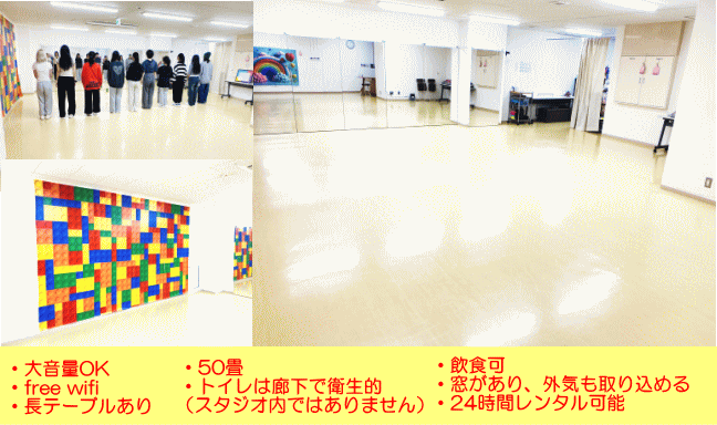 広さ:およそ60畳、ダンスなら30名、ヨガ等なら40名までOK!